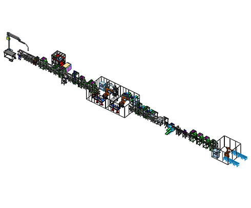 實(shí)現(xiàn)電芯上料,極耳裁切,整形,電壓內(nèi)阻測(cè)試,等離子清洗,電芯貼泡棉和電芯翻轉(zhuǎn)等功能模組焊接入殼組裝段實(shí)現(xiàn)極柱激光清洗,上巴片,激光焊接巴片,安裝采集線及測(cè)溫頭等功能。