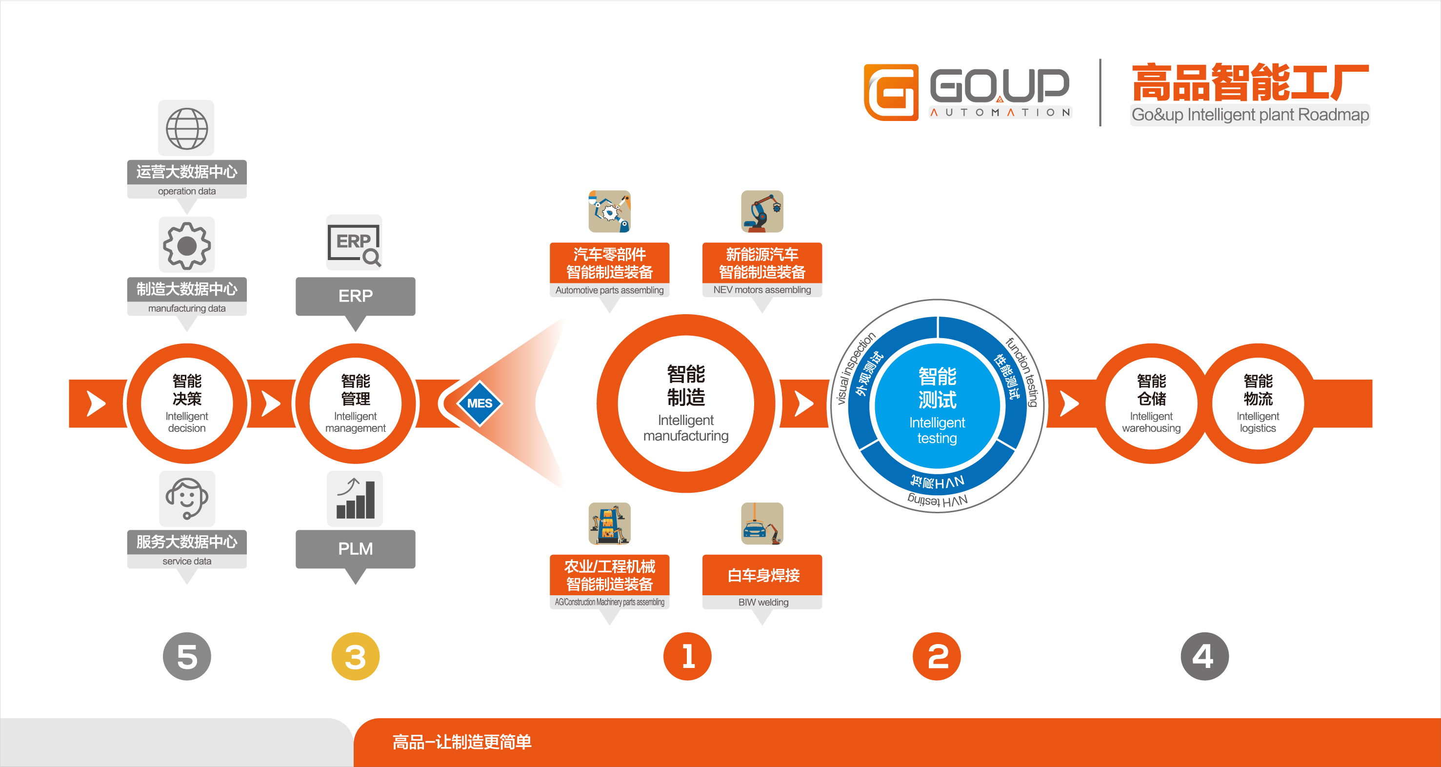 基于現有技術基礎,高品提出“智能決策、智能管理、智能制造,智能測試,智能倉儲物流”的智能工廠五步走技術路線: